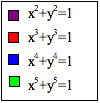 In this assignment, I want to explore the changes in the graph of xn + yn = 1 where n=2,...25. I start with graph of x2 + y2 = 1 which I know that it is a circle having radius 1 and centered at the origin. Then I tried x3 + y3 = 1. It is a curve passing through the points (1,0) and (0,1). Then I tried x4 + y4 = 1. It has a shape between a circle and a square. Then I wonder about x5 + y5 = 1. It was a curve again passing through the points (0,1) and (1,0) but it was passing above the curve of x3 + y3 = 1 between x=0 and x=1, but below the curve for the other values of x. Then I tried x6 + y6 = 1 and x7 + y7 = 1. Again I observed that for x6 + y6 = 1, I get a shape between a square and circle such that much more close to the shape of a square and for x7 + y7 = 1, I get a curve intersecting with the previous curves at the points (0,1) and (1,0) and lies above the curves between x=0 and x=1 and lies below otherwise.
