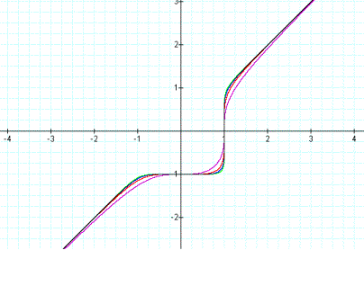 Then I wonder about the other side (left part) of the graph. Whether there exists graph of an equation which converges to the graph of even powers of the equation. So, I decided to start with negative powers of the given equation, i.e. x-n + y-n = 1.