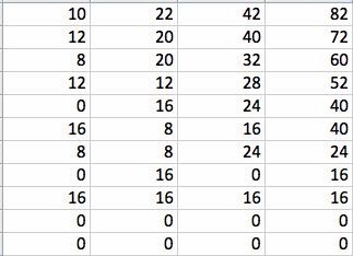 Here is how I started. I began with something simple such as successive multiples of twos in each column and my result shows only 7 rows.