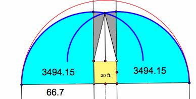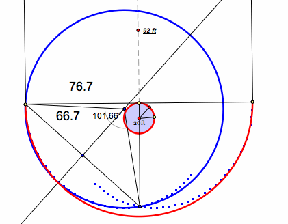 The blue sectors are each 1/4 of a circle that has a radius of 66.7 ft.