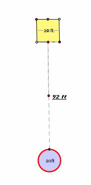 This problem asks for me to explore the area over which a goat can graze if a stake is moved along a line segment from the midpoint of the side of a shed to the edge of a silo. The rope to which the cow is tethered measures 76.7 ft. The barn is 20x20 ft. The silo has a diameter of 20ft. And the distance from the barn to silo is 92 ft.