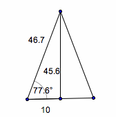 First, the altitude of the whole white triangle is drawn. Since it is an isosceles triangle, the altitude is also a perpendicular bisector. The sides of the left small white triangle are found to be 10, 46.7, and 45.6 ft.