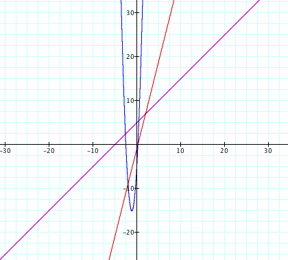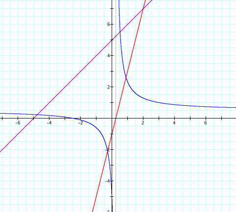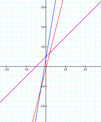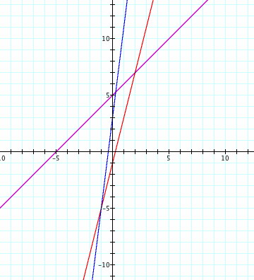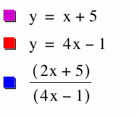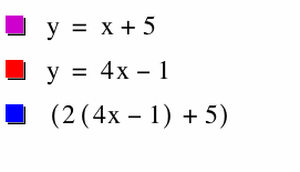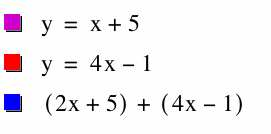 Let f(x) = x + 5 and g(x) = 4x - 1. [Note: In the graphs below, f(x) is represented by the purple line, g(x) is represented by the red line, and the blue function represents the graph h(x).]