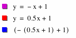 This composition of f and g is also interesting to examine. Here, we are substituting g(x) into the x term of f(x). If we think about this as a series of transformations, we can see that our original g(x) line is being made negative. In other words, our red line is flipping over the y-axis. The second transformation made is a shift downward by 1. When we analyze the composition of f and g in this way, it should provide another way of justifying why h(x) is a linear function.