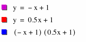 It is interesting here to compare the multiplication of this pair of functions to the multiplication of our first 2 functions. As expected, h(x) is a parabola. However, this time the parabola opens downward. This is because the terms that produce our x-squared term are -x and .5x, one is positive and one is negative. Since the sign of our squared term is negative, we have a parabola opening downward.