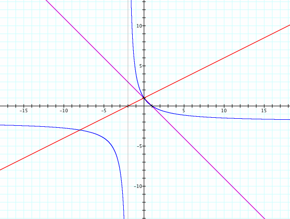 The graph of h(x) here looks very similar to the one in our first pair however there are some differences. It is also a hyperbola, as expected, but our critical points have changed. We can see that we have a vertical asymptote at x = -2, an x-intercept at (1, 0), and a y-intercept at (0, 1).