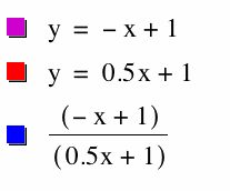This combination on our function pair gets a little more interesting. As you can see, the resulting fuction h(x) is a hyperbola. This is the exact definition of what a hyperbola is, it is a function in the form h(x) = p(x)/q(x) such that p(x) and q(x) are polynomials. In this case p(x) and q(x) are both linear and are represented by f(x) and g(x) respectively. It is also important to note the important parts of our hyperbola. We have a vertical asymptote and x = 1/4, an x-intercept at ( -5/2, 0), and a y-intercept at (0, -5).