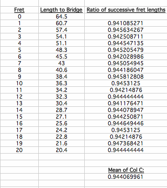 We can see that the ratio between successive frets is almost the same throughout. The arithmetic mean of these values is 0.9441. So, what if we think about the ratio between fret 0 and fret 2?