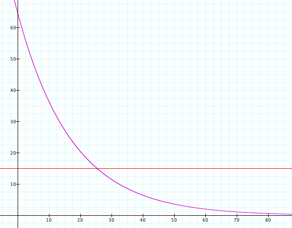 One way to do this is to graph the line y = 15 on our calculator and see where it intersects the exponential line that we found to fit our data.