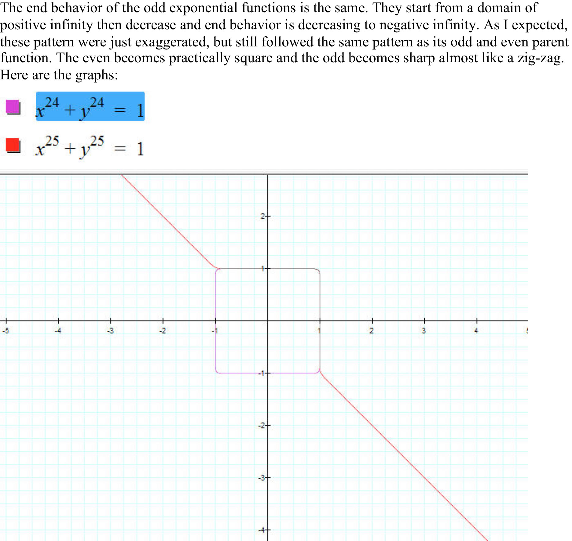 Graph What do you expect for the graph of What was interesting was the difference between an odd exponent and the even exponential problems. The even exponents started out circular and became increasingly less round as the even degree increased.