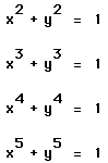 The first similarity that I see between the graphs is that they all have a y-intercept through 1, and also an x-intercept through 1. This is because of the property that for each point on the graph of the equation, the x-coordinate raised to a power plus the y-coordinate raised to the same power must equal 1. If one coordinate for the point is already 1, the other coordinate must be 0 to make the equation true for any value of the degree.