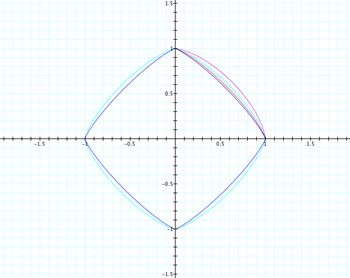 These graphs are similar to the graphs of the even degree equations in that they seem to be approaching a square. However, this square is rotated 90°, so it is more of a diamond. Like the previous fraction degrees, however, the "corners" are pointing inwards instead of outwards due to the characteristics of the equation. Once again, the domain and range is restricted to being between -1 and 1 due to the equation being equal to 1.