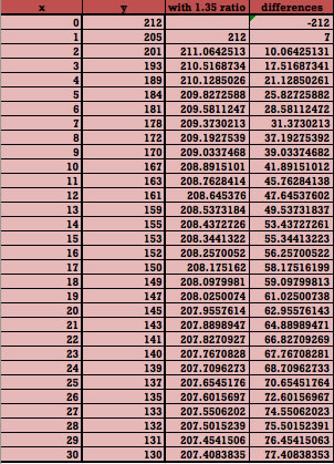 This first aspect of this function that is easily predictable is the y-intercept. Since this is where x = 0, I can assume that the first point on the spreadsheet is the y-intercept, which is (0,212). We can think of this number as how many units all of the points in the parent function are shifted vertically since the parent function normally always has a y-intercept of 0. Therefore, to find what type of parent function this data fits, I can subtract 212 from each of the function values and obtain the following data: