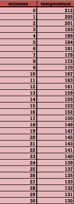 This is data for the temperatures of a cup of water at various minutes during its cooling process, beginning with its initial temperature at x = 0.