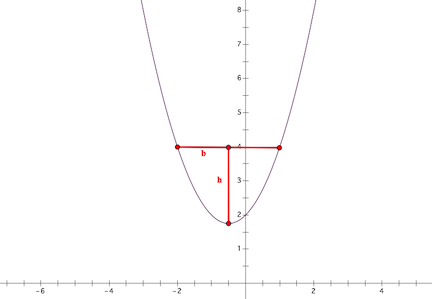 where b is the base and h is the height. The height goes between the vertex of the parabola and the base while the base is made from the intersection of a horizontal line segment intersecting both sides of the parabola. See the following diagram made with Geometer's Sketchpad 4.0: