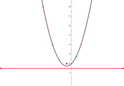 One can visually see that the vertex of this parabola is equidistant from the vertex and the directrix. We can also pick some random points on the parabola to find the distance from them to our directrix and focus so that when we translate our parabola, we can see if ths distance is preserved and thus confirming that the shape and size is also preserved. Let's pick three points, two on the left side of the parabola and one on the right side. These points will be (-2,0), (-3,4), and (0.5,-1.25):