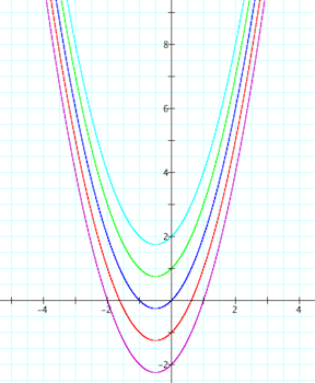 For the sake of analyzing the mathematics behind these parabolas, I will use the simplest form possible by assigning a=1 and b=1. c will range from -2 to 2. The following is the graphs of those equations using Graphing Calculator 4.0: