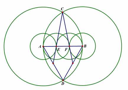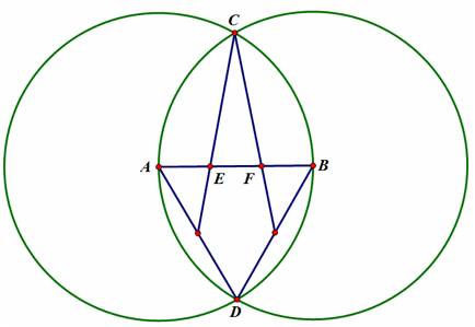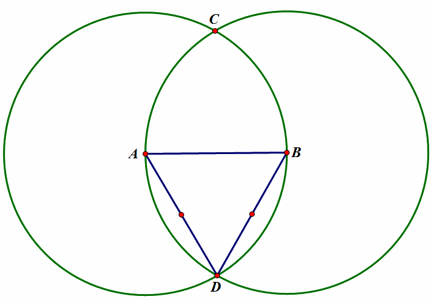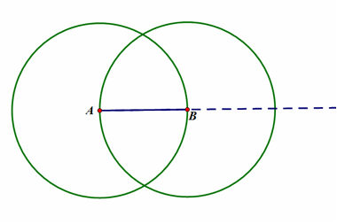 1. Start with line segment AB, then construct a circle with center A passing through point B; do the same for circle B.