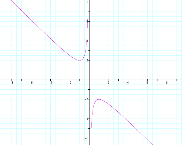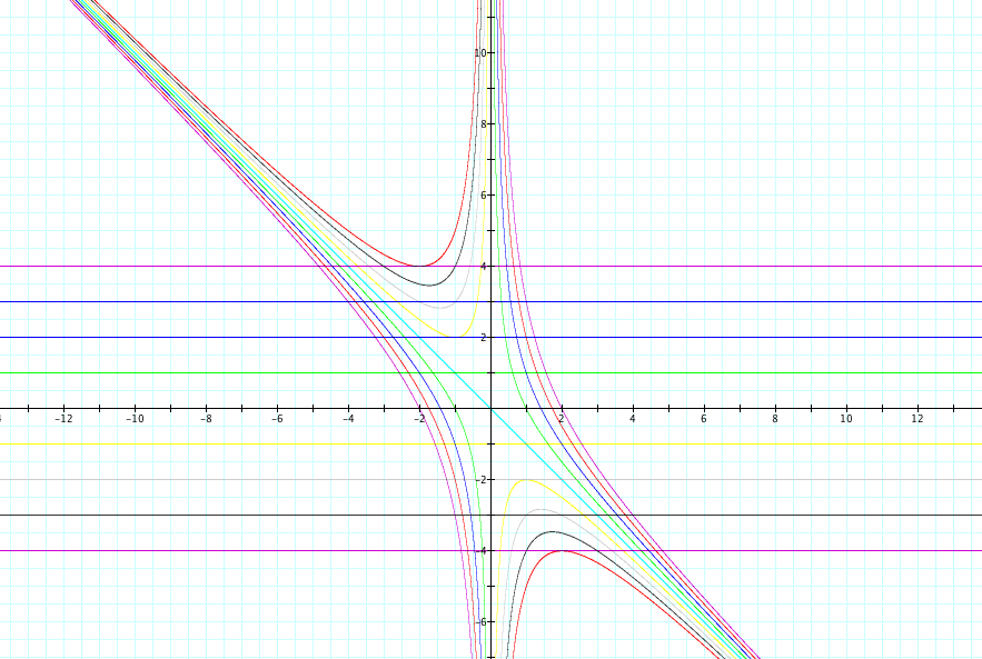 For interpretation of this graph wherever there is a parallel line to the x-axis (all new equations), if it intersects the curve in the xy (xb) plane then the intersection of these points will correspond to the solutions of the original equation for the specific value of y (which is b). So if we are looking at all possible values of y (b), we want to figure out the "pattern" of the amount of solutions depending on the value of y. For this last part we will change our y back to a b so that we understand the final conclusion. So we can see that when -2 < b < 2 there are no real solutions, when b = -2 (will be a positive solution) or b = 2 (will be a negative solution) there is one real solution, and when b > 2 (will be negative solutions) or b < -2 (will be positive solutions) there are two real solutions.