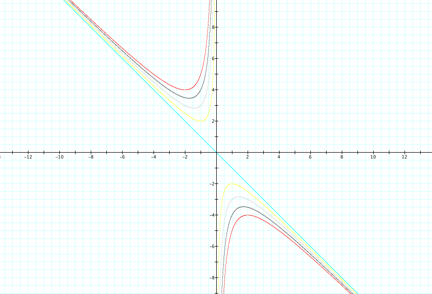 You can see that when c is equal to 0 that it creates an asymptote here for the hyperbolas. It appears that asymptotes are located at the y-axis and x = -y. It seems when c is positive that the graph will be on the top and bottom the the X that is formed from the two asymptotes.