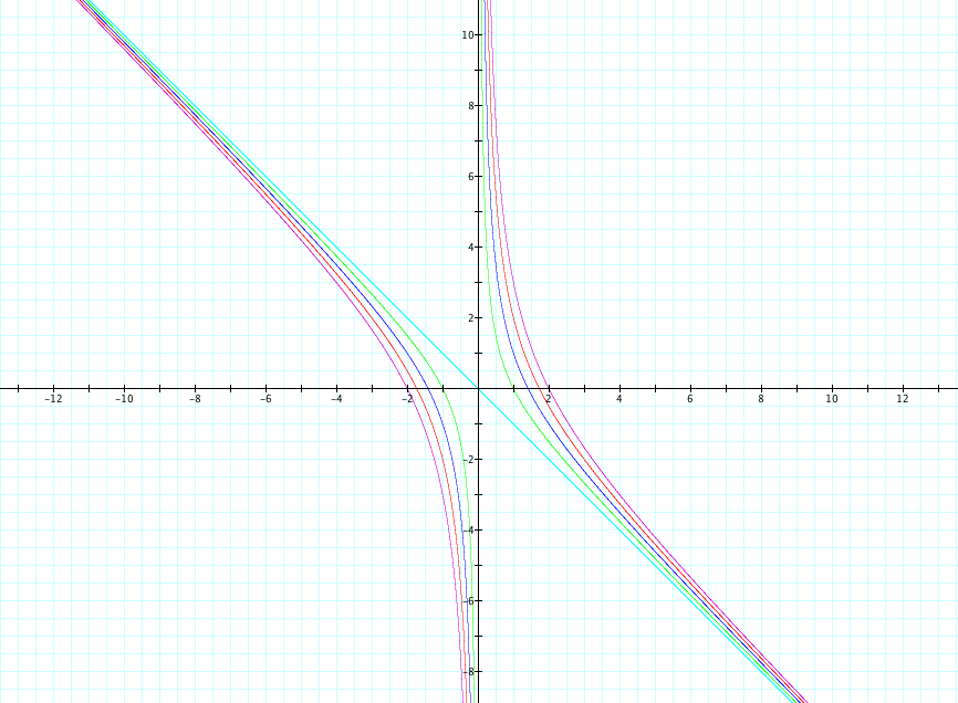 Again we see that when c is equal to 0 that the asymptote is formed. It appears that these sets of graphs have the same asymptotes as before. It seems that when c is negative it goes on the left and right side of X that is formed by the two asymptotes.