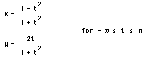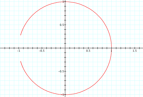 We can see that this is almost a circle. The circle has a radius of 1, but the circle is not fully closed. It seems that if the circle was continued on the left side that the radius is still 1. To figure out why this is, we have to look at values of t. Because the graph stops on the x-axis at the same place on the top and bottom of the circle, I thought this would be an asymptote. If you substitute -