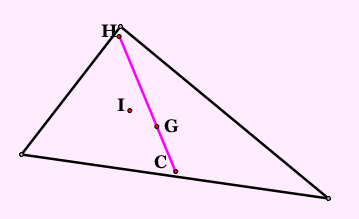 Take any triangle. Construct a triangle connecting the three midpoints of the sides. This is called the MEDIAL triangle. It is similar to the original triangle and one-fourth of its area. Construct G, H, C, and I for this new triangle. Compare to G, H, C, and I in the original triangle.