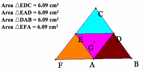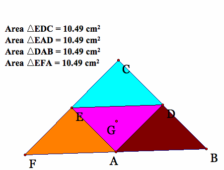 Arguably, the most common of centroid explorations and proofs is the 1:2 ratio of the segments made by the intersections of the medians. This may be easier to see but holds for the centroid of any triangle (the ratio will stay the same despite the area or dimensions). The figure below shows the relationship of one of these segments. This relationship hold from all three median segments. We can also see that the smallest segment GC is 1/3 of the median FC while FG is 2/3 of FC. (This makes more sense of the 1:2 ratio because 2/3=2(1/3)).