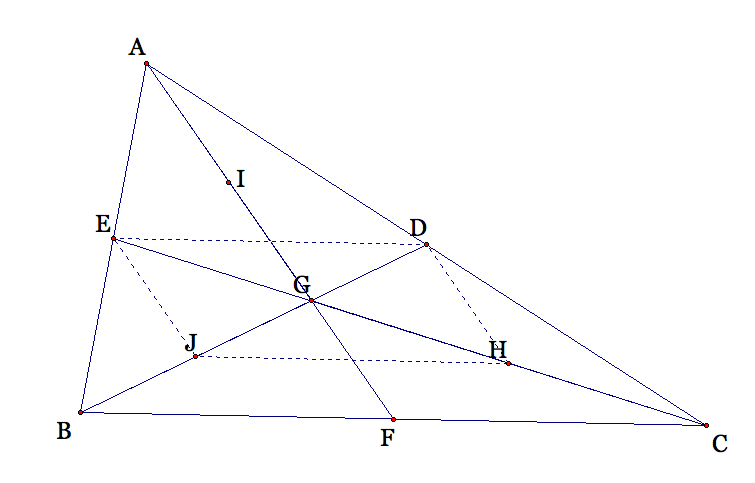 Take the midpoint of the segment AG, BG, and GC. The segment JH is parallel to segment BC and JH=1/2BC by the mid-segment theorem. Similarly, ED is parallel to BC and ED=1/2BC by the mid-segment theorem. If JH and ED are both parallel to BC then JH and ED are parallel. Likewise, if JH=1/2BC and ED=1/2BC, then JH is congruent to ED. Therefore, by the properties of parallelograms, the quadrilateral EDJH must be a parallelogram. Another property of parallelograms is that the diagonals bisect each other. So JG=GD and EG=GH. The intersection appears to be the centroid of the original triangle. Let's construct another quadrilateral IJDF (shown below).