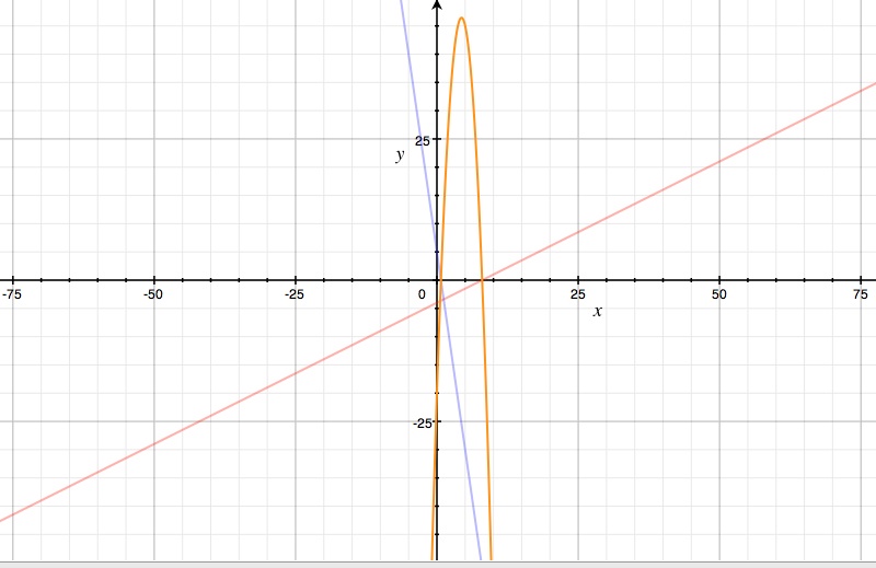 When multiplying the two linear functions, it results in a quadratic equation. The graph of the quadratic intersects the graph of each linear function twice, therefore having four points of intersection with the linear functions. Two of the points of intersection also happen to intersect the x-axis. These points of intersection indicate the zeros of the quadratic function. Again, with the graph of the two linear functions and their product, it helps visualize how the roots, or zeros, of a quadratic function relates to it’s linear factors. The other points of intersection also have significance when comparing the linear functions to all the graphs of the functions of the product, quotient, and composition of the linear functions, which will be discussed later.