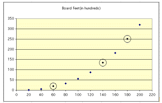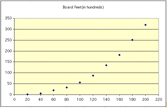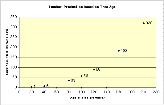 Let's be sure we agree on how to interpret the table. Based on previous experience, people in the lumber industry claim that, in general, a tree that is 20 years old will provide 100 (1 x 100) board feet of lumber; a 200 year old tree will yield 32,000 (320 x 100) board feet.
