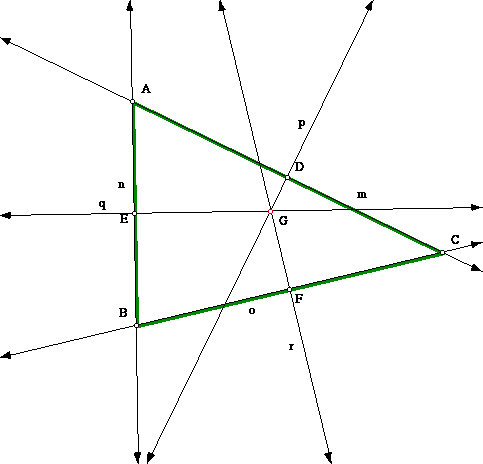 * Construct the midpoints of each of these lines and name them P, Q, and R, respectively.