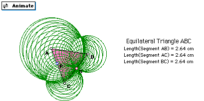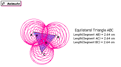 The envelope of curves produced is three circles with equal areas and the centers being the vertices of the triangles. We know this because of the way they were created. The radius of all the circles is the same because the point S was created to be equidistant from the vertices on the triangle. When the point S is moved inside the equilateral triangle you always get an envelope of three circle with areas that vary according to where S is placed. From the overlap of the circles we see a three leaf rose.
