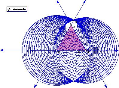 Next we moved S to the outside of the triangle, this still produced three distinct circles. If S lies on the line of the vertices then it appears that only two circles are created. If you actually look at the animation, three circles are being created, but the third circle is enclosed in the two you see on the screen. Below is a picture of the envelop of circles.