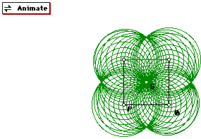 The second set of explorations were done moving the point about a square and varying the location of point S. This link to GSP can be used to explore the curves. Click here to animate. First we let S be the midpoint on one side of the triangle. Four circles are created, two pair that are congruent. The vertices of the square are the centers of the triangles. Below is a picture of what is created.
