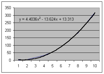 This is the graph that was interpolated by Excel. Excel can also create a funcion of best fit. I chose a second degree polynomial and Excel created this new function on the same graph and also created the equation for this line of best fit.