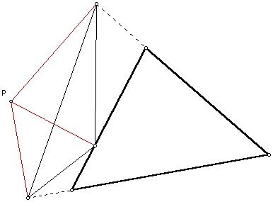 A pedal triangle is the triangle that is formed when a the perpendiculars of the legs of the given triangle pass intersect through a given point P. This given point P is called the pedal point. The picture shows an example where the pedal point is outside of the triangle and the legs of the triangle were extended. The perpendiculars are colored red to better understand the construction.