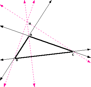 The ORTHOCENTER, H of a triangle is the common point of intersection of the three lines containing the altitudes. Recall that an altitude is a perpendicular segment from a vertex to the line of the opposite side.