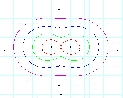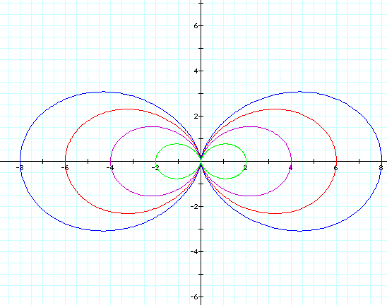 We now examine the graph when a varies. We graph the equation when a>b, b=1 and k=2. The following graph shows when a=1, a=2, a=3 and a=4.