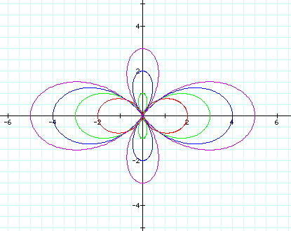 As a increases the leaves lose their form and they get further away from the origin. Now we can examine what happens if a and b increase together. The following are graphs for a=b=1, a=b=2, a=b=3 and a=b=4 while k remains constant at two.