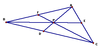 From Ceva's Theorem, we know that if the segments AD, BE and FC are concurrent (if they intersect at a point, which these segments do at point P), then the product of the ratios given above does equal one.