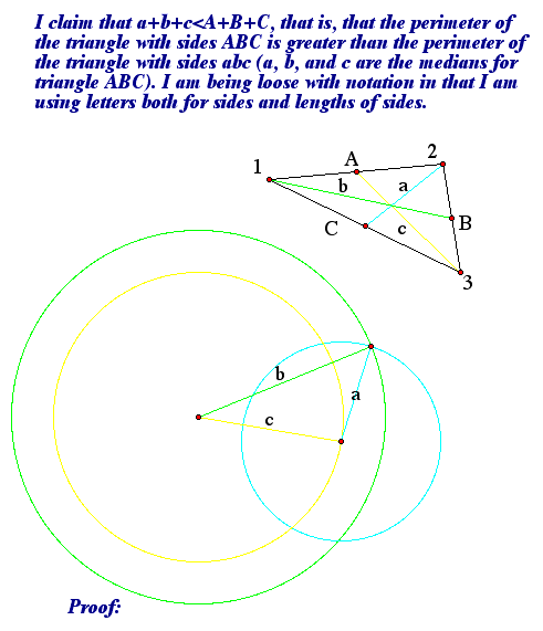 1. Construct a triangle and its medians. Construct a second triangle with the three sides having the lengths of the three medians from your first triangle. Find some relationship between the two triangles. prove whatever you find.