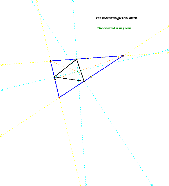 My first observation is that the centroid stays inside the pedal triangle. Consider the following generic picture: