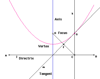A more geometric definition of the parabola is the set of all points in the plane equally distant from a fixed line and a fixed point not on the line. The fixed line is called the directrix. The fixed point is called the focus. The following is part of a parabola created using GSP.