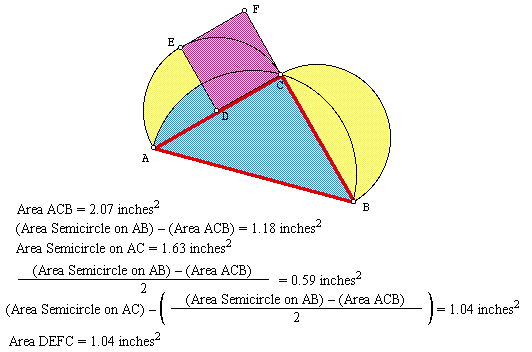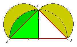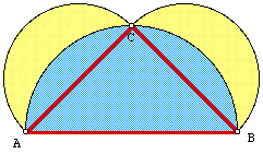 Therefore the area of the lune on AC and the area of triangle AGC are equal. Since AGC is an isosceles right triangle, its area is