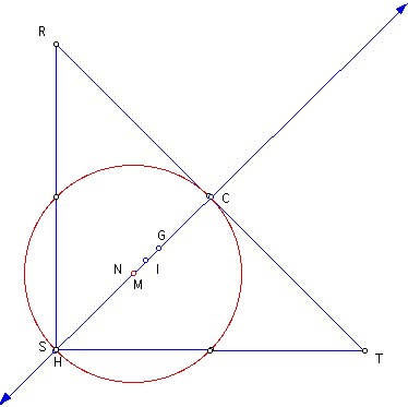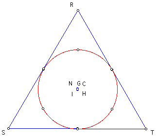 The center of the Nine-Point Circle is labeled as N, the centroid is G, the orthocenter is H, the circumcenter is C, and the incenter is I for the different shaped triangles of triangle RST.